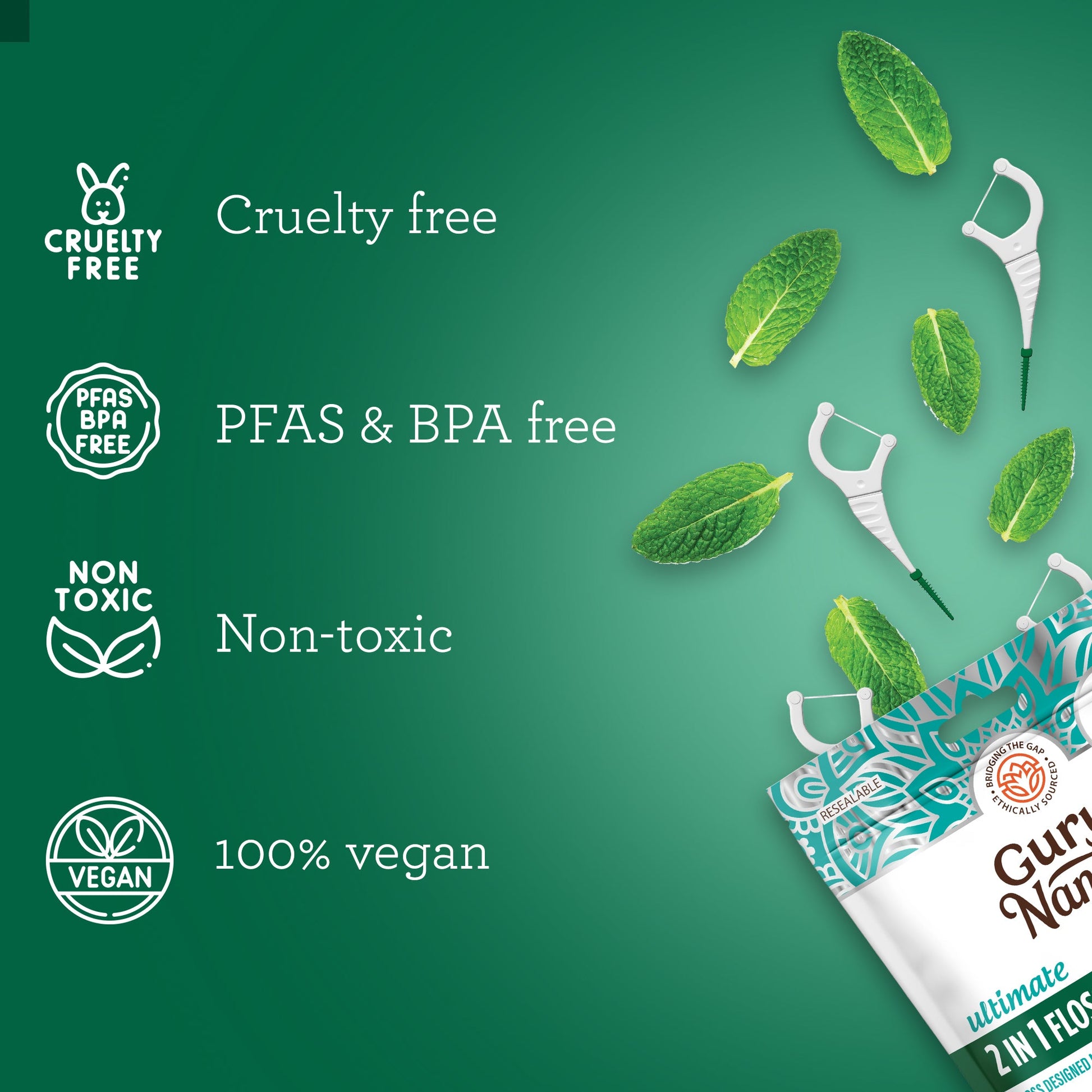NO SHREDDING: GuruNanda 2-in-1 Dental Floss is designed to provide a seamless flossing experience, as they are shred-resistant and will not break midway, ensuring a thorough clean every time. Crafted with high-quality, cruelty-free plastic, our dental floss picks are also PFAS & BPA Free, and non-toxic, making them a reliable and safe option for your oral care needs.