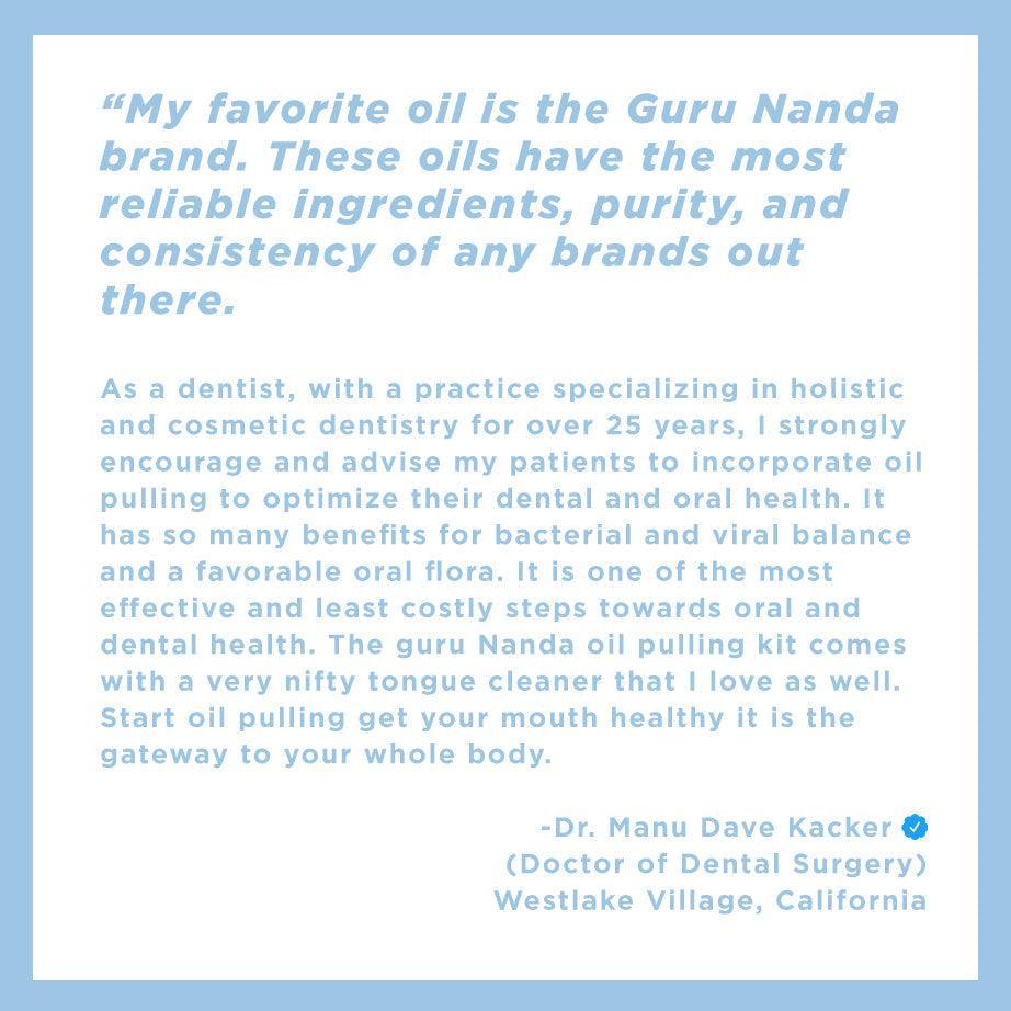 *GuruNanda oil pulling is a pre-brush rinse with less density than coconut or sesame oil; that¡¯s hydrophobic and lipid inspired heavily by Ayurvedic knowledge. It¡¯s a preventative added part of an oral care regimen that involves tongue scrapping, brushing flossing, and water flossing. It is not a replacement for your dentist, nor does it cure active dental problems including but not limited to infections, deep cavities, gingivitis, etc.?