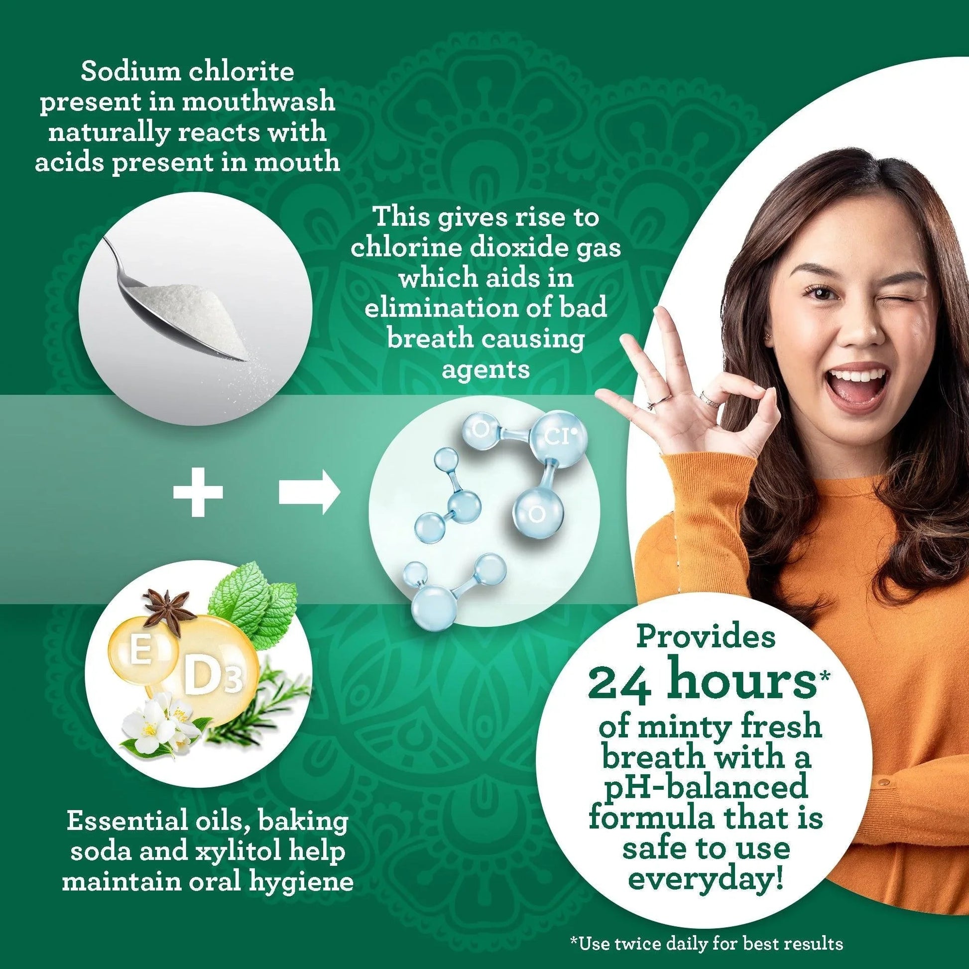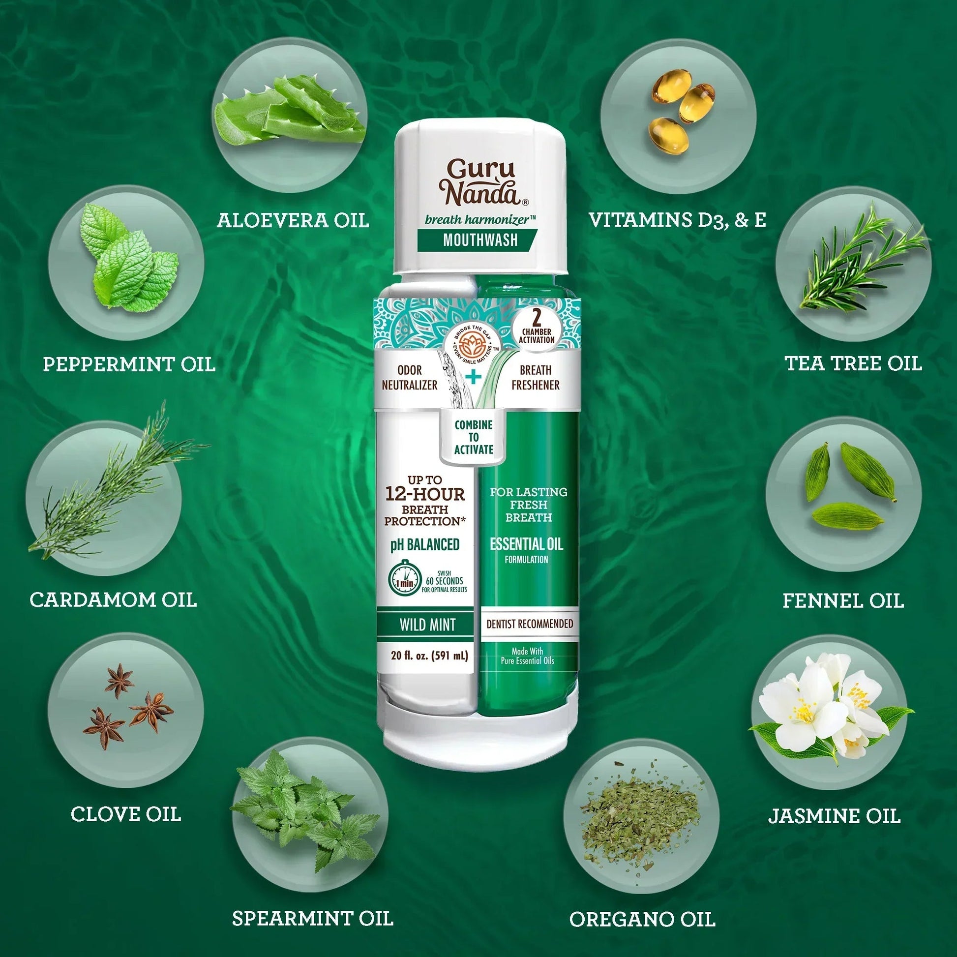 DUAL-ACTION FRESHNESS: GuruNanda Breath Harmonizer Oral Rinse Mouthwash features a fluoride-free, dual-chamber formula combining sodium chlorite & essential oils that helps eliminate unpleasant odors, providing 24 hours of fresh breath when used twice daily.