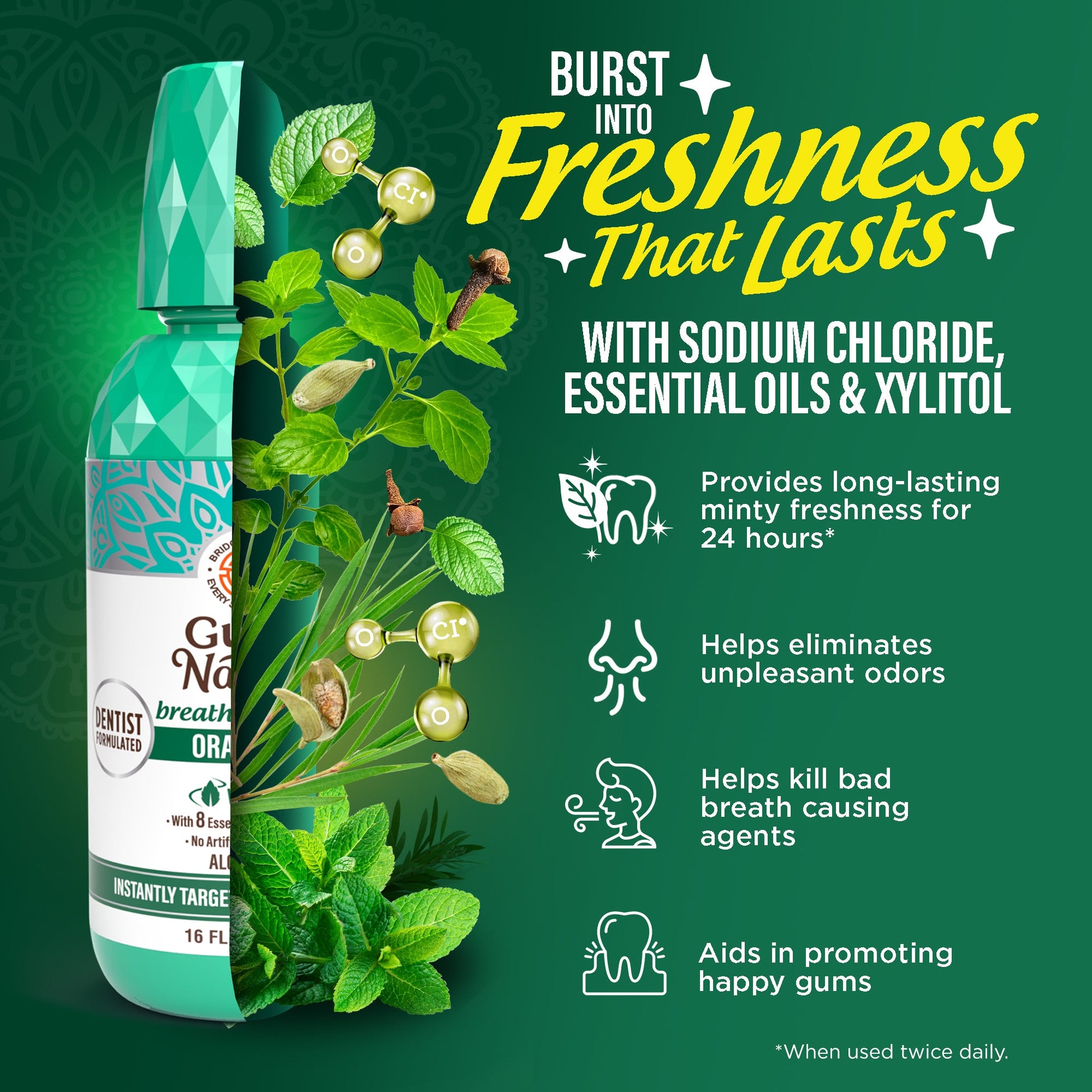 LONG-LASTING FRESH BREATH: GuruNanda Breath Harmonizer Oral Rinse is an alcohol- and fluoride-free mouthwash with sodium chlorite and 8 pure essential oils to target bad breath germs and promote lasting freshness.