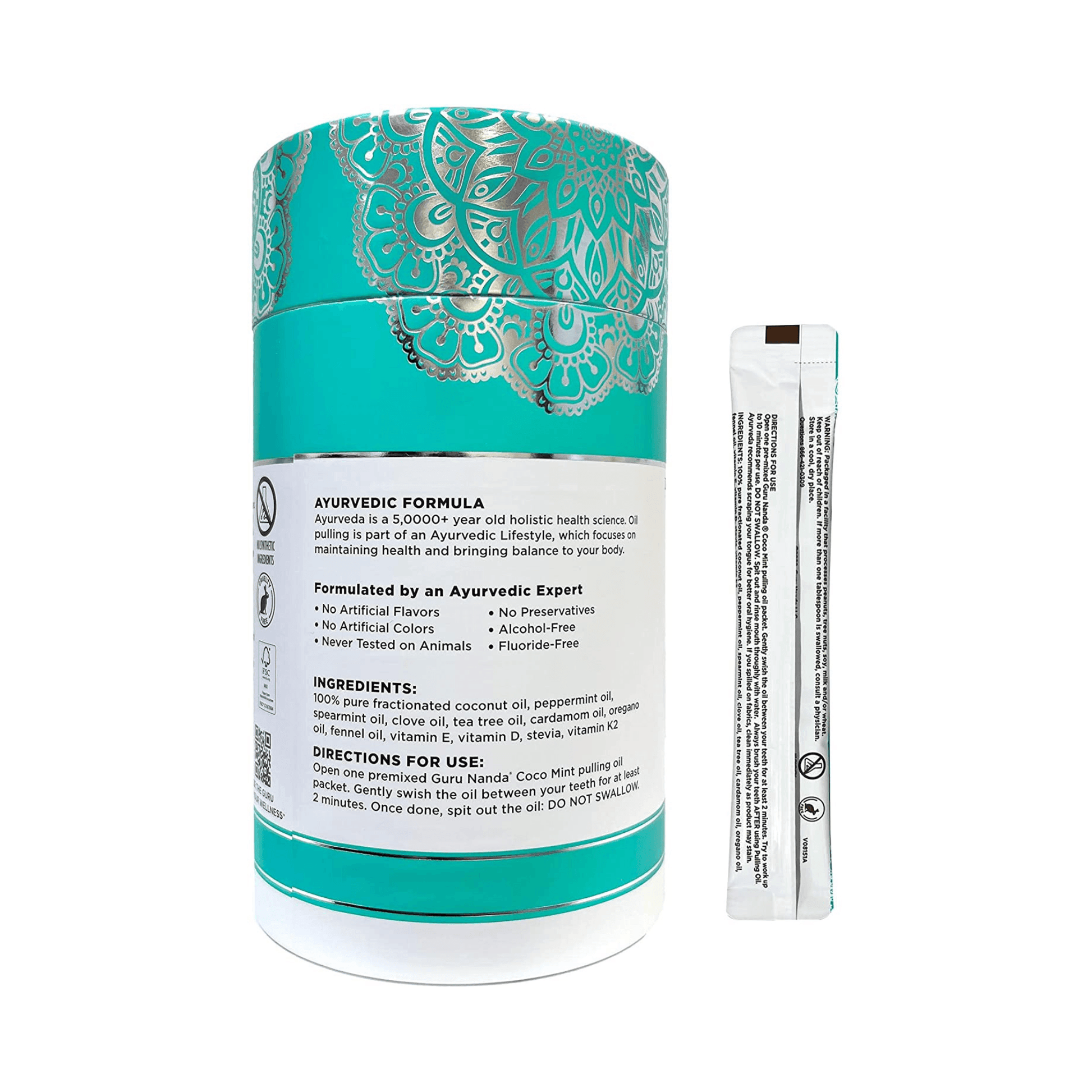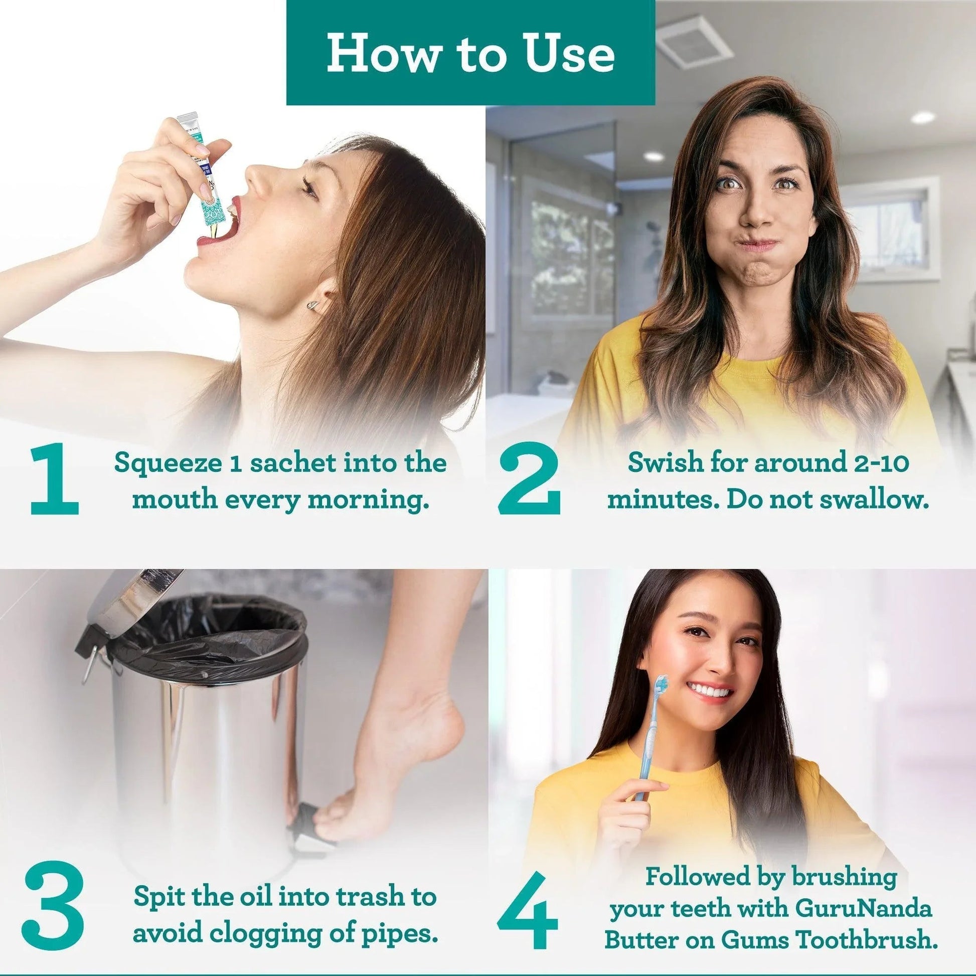 This convenient, pre-mixed sachet requires no measuring¡ªjust tear open the sachet, squeeze the oil into your mouth, and start swishing. Swish for 2 minutes, gradually working your way up to 10 minutes. DO NOT SWALLOW. Spit the oil into the trash to avoid clogging pipes.?Follow up with brushing your teeth using the GuruNanda Butter on Gums Toothbrush for the best results.