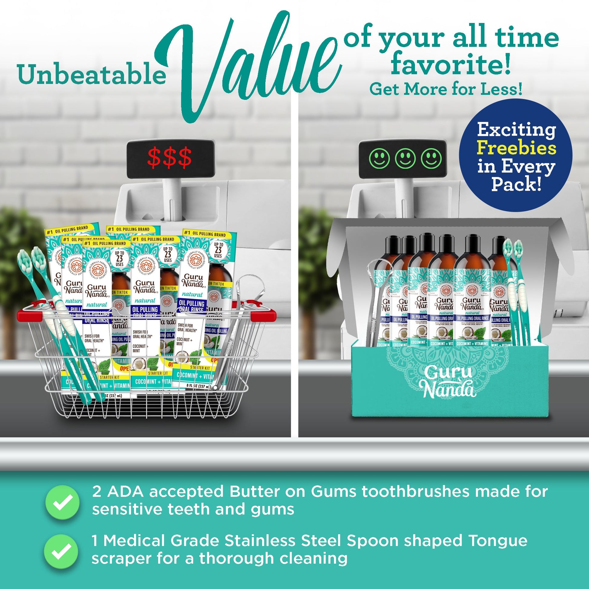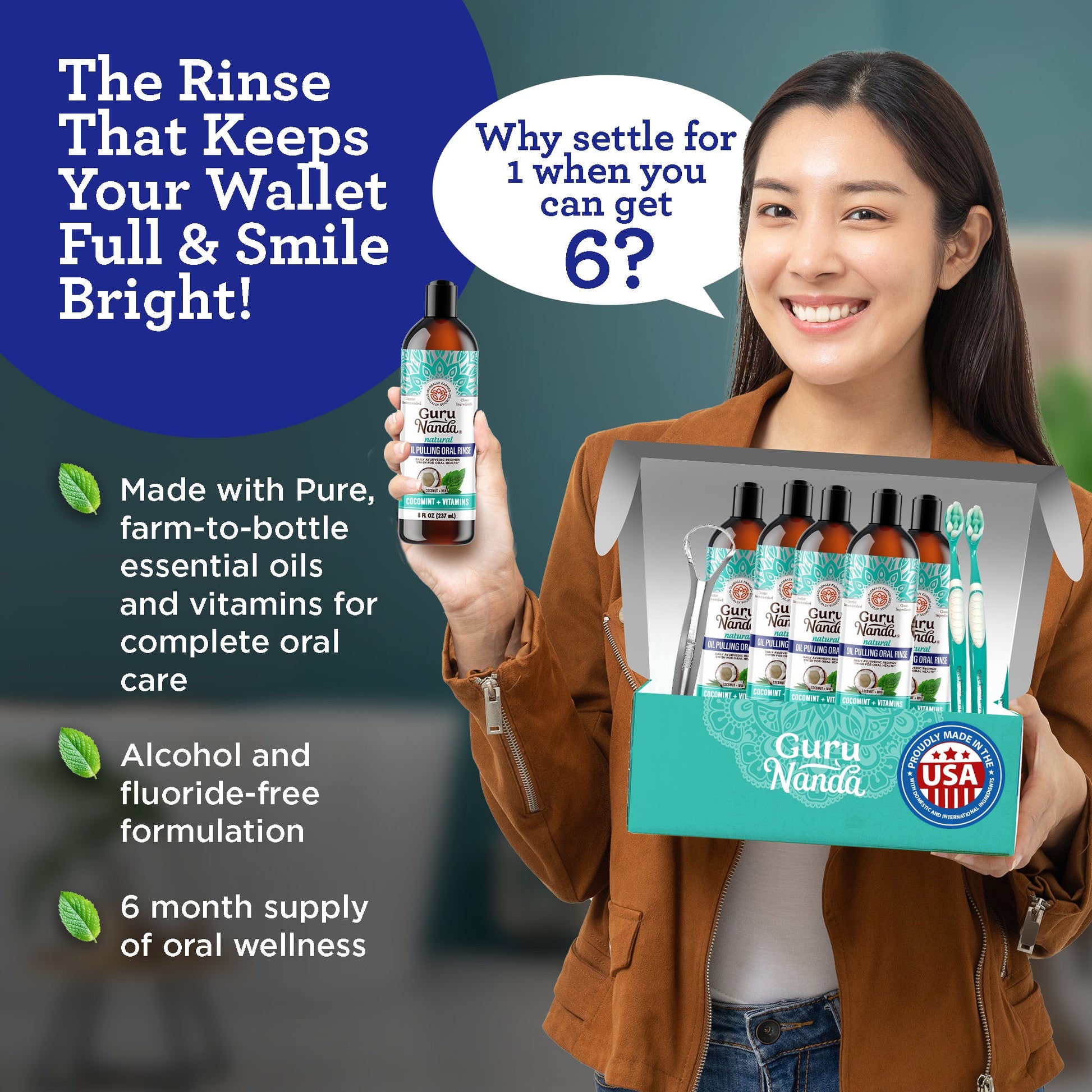 *GuruNanda oil pulling is a pre-brush rinse with less density than coconut or sesame oil; that¡¯s hydrophobic and lipid inspired heavily by Ayurvedic knowledge. It¡¯s a preventative added part of an oral care regimen that involves tongue scraping, brushing flossing, and water flossing. It is not a replacement for your dentist, nor does it cure active dental problems including but not limited to infections, deep cavities, gingivitis, etc.