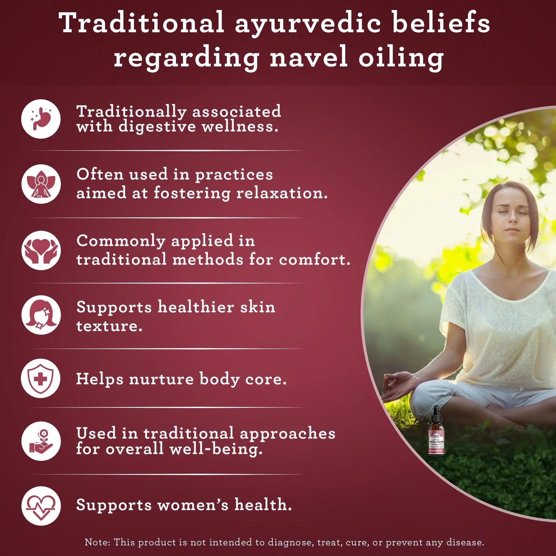 TRADITIONAL AYURVEDIC PRACTICE:?Inspired by ancient Ayurveda, GuruNanda Navel Oiling supports holistic wellness by deeply nourishing your body through the navel.