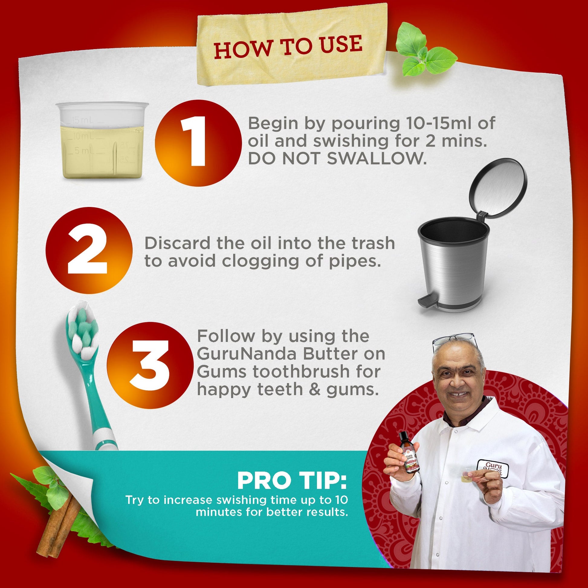 Pour 10-15ml of oil pulling, swish for 2 minutes, & gradually increase to 10 minutes. Discard the oil into the trash to avoid clogging pipes. Swishing on an empty stomach is recommended for best use. Remember to follow by brushing your teeth using the GuruNanda Butter on Gums Toothbrush.